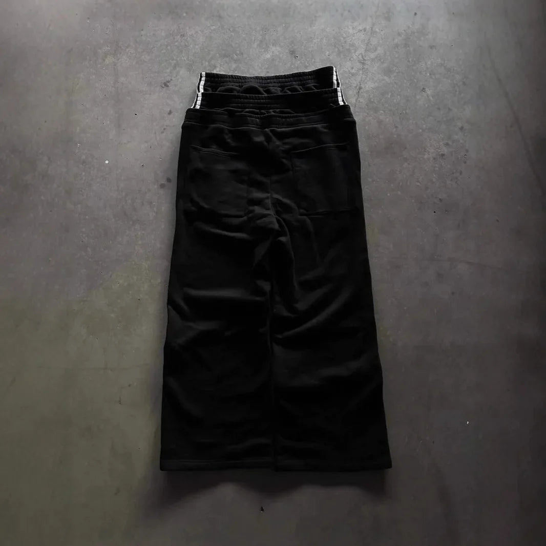 Wide-leg trousers with a double waistband inspired by American Y2K and high-street fashion. Their loose fit, pronounced abrasions, and embroidered lettering give them a vibe that blends retro, Harajuku, and modern streetwear.