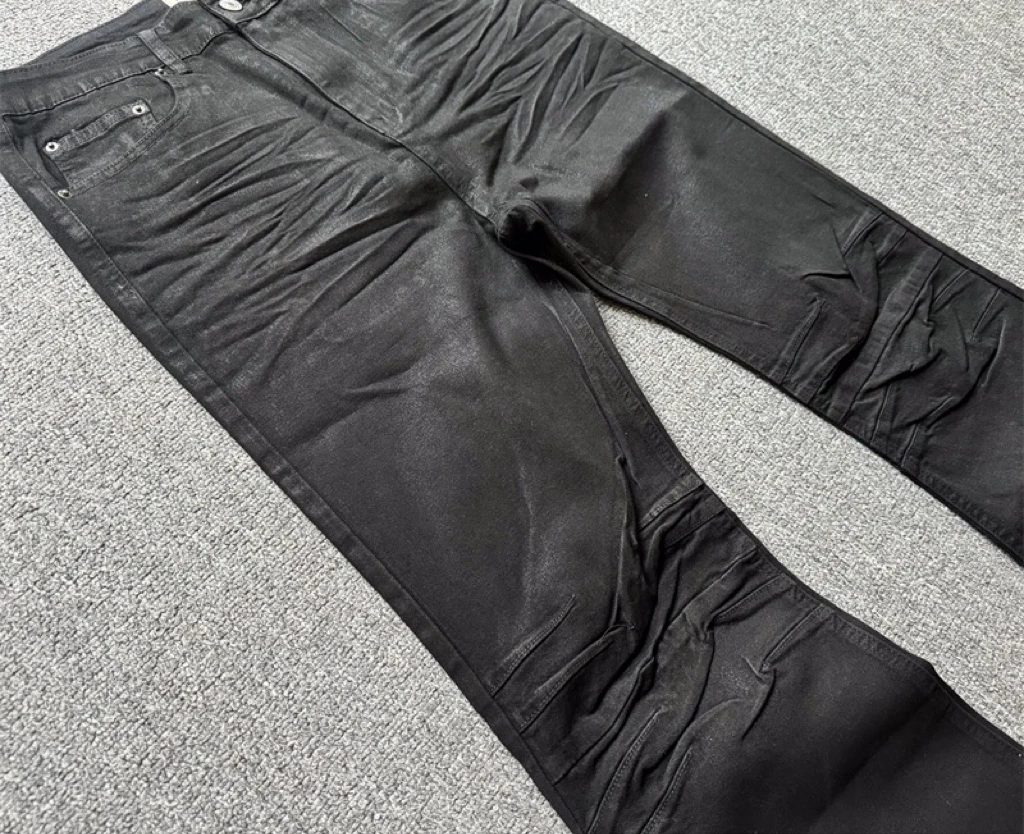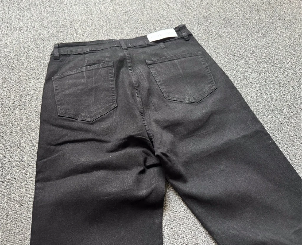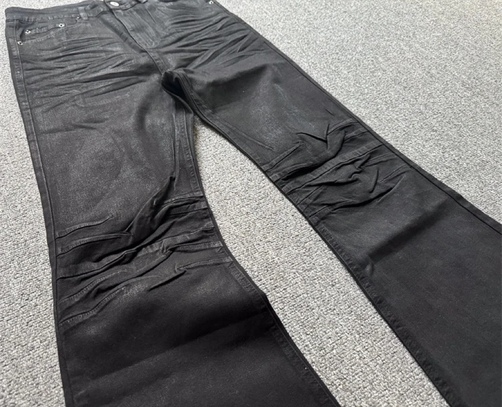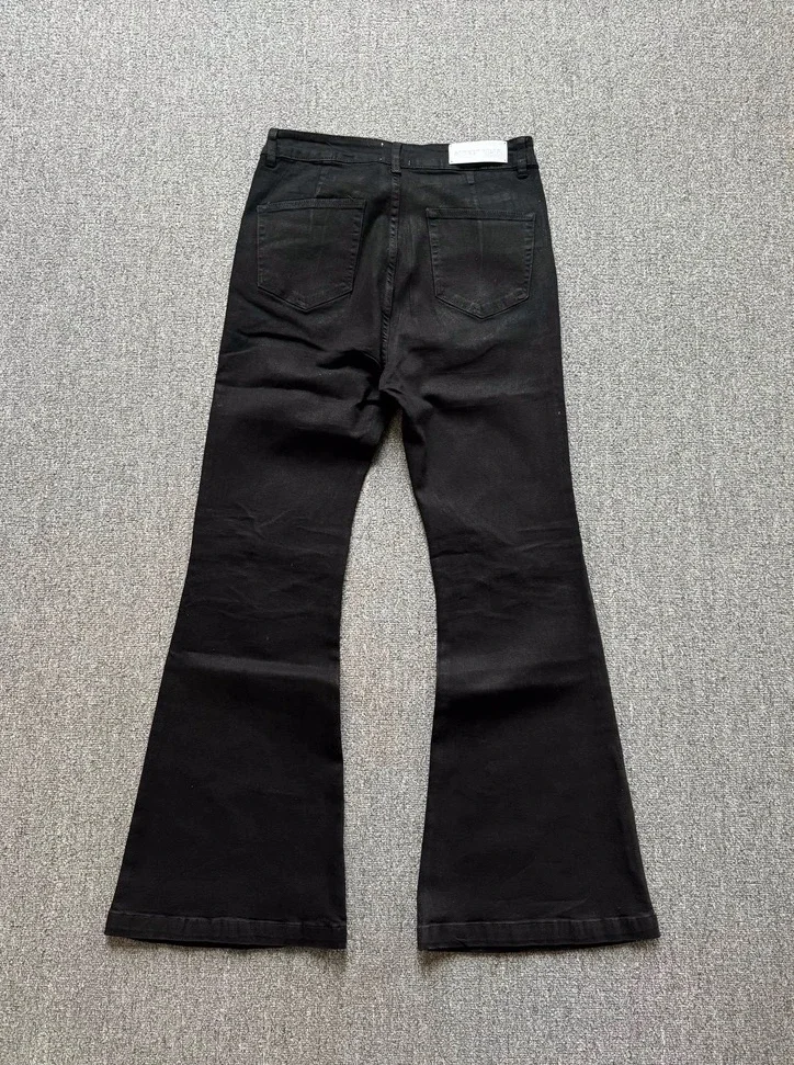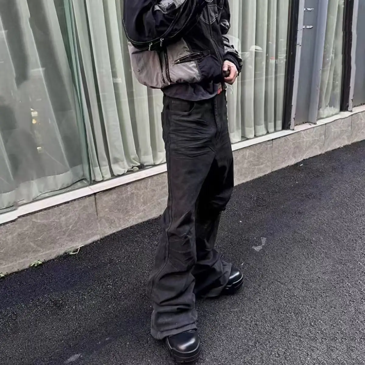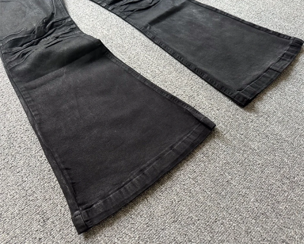 Black American Retro high-street jeans in coated denim. Micro-flares (bootcut), low rise, and a relaxed vintage look with a touch of gothic. Unisex, year-round, perfect for streetwear styling.